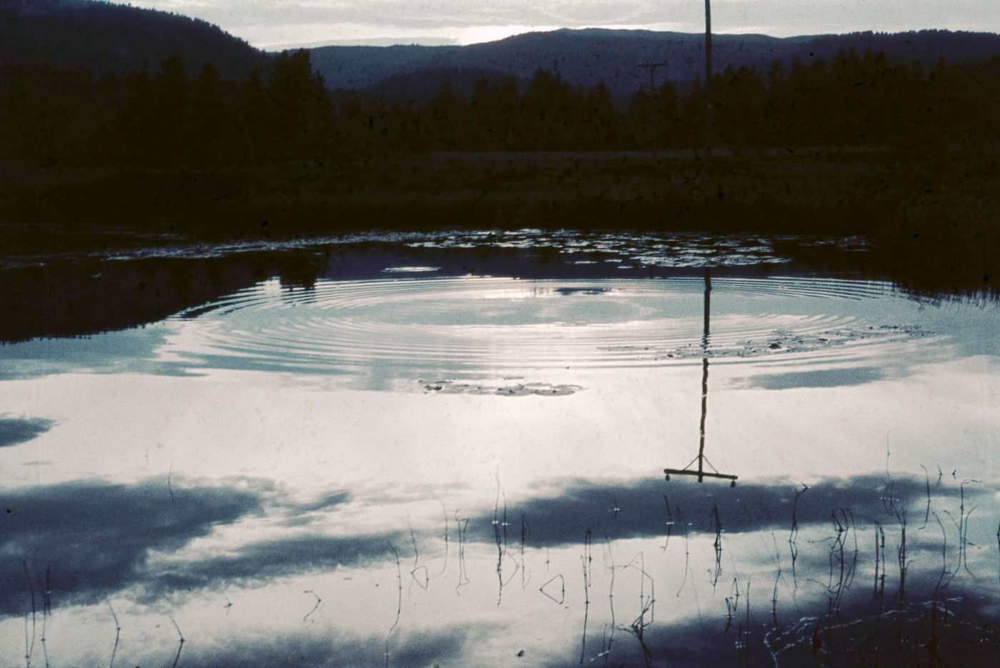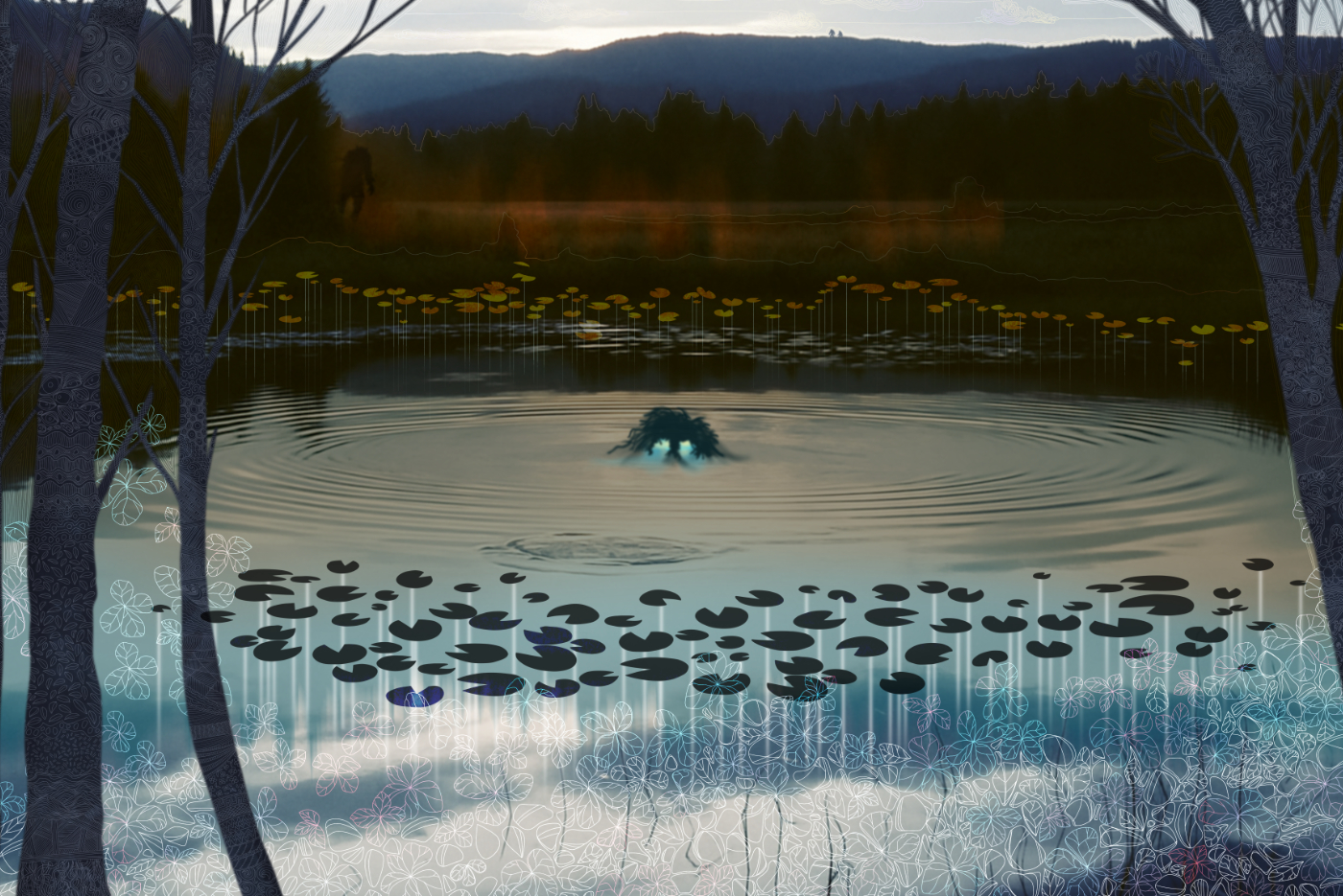 Dette bildet startet egentlig uten noen klar plan. Jeg begynte å jobbe med farens gamle foto fra 1960 – et stille skogstjern med ringer i vannet – og lot prosessen gå sin gang. Etter hvert merket jeg at stemningen endret seg. Det ble mørkere, mer ladet. Litt eventyraktig.